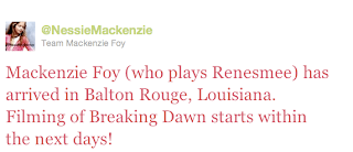 Маккензи Фой (Ренесми) приехала в Батон Руж, Луизиана.Съемки начнутся в течении нескольких дней.
